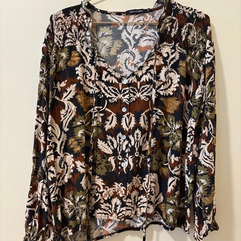 Nydelig byTiMo Bluse; mønstrete med blomsterdetaljer og lange ermer.