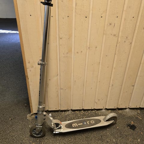 Micro sparkesykkel i sølvfarge laget av aluminium. Har justerbart styre og to hjul. Egnet for barn og voksne for kortere transport eller fritidsbruk.