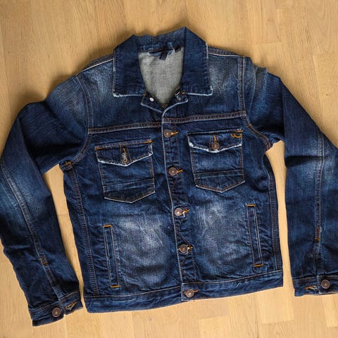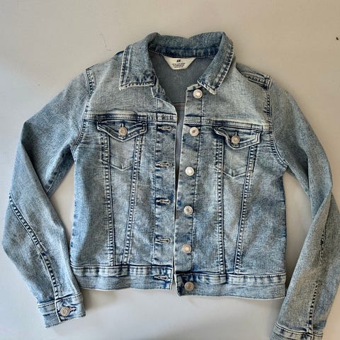 Exit denimjakke i størrelse 140 for barn, unisex. Jakken er blå med brodert detalj på ryggen med teksten 'Rock'. Laget av denimmateriale.Kan sendes.