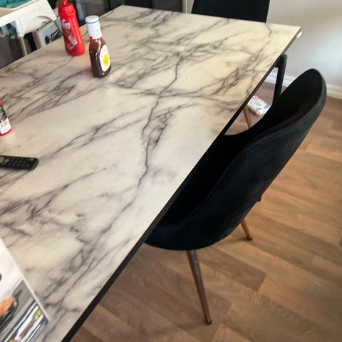 Pent brukt spisebord selges. Bordet er laget av papirlaminat.
