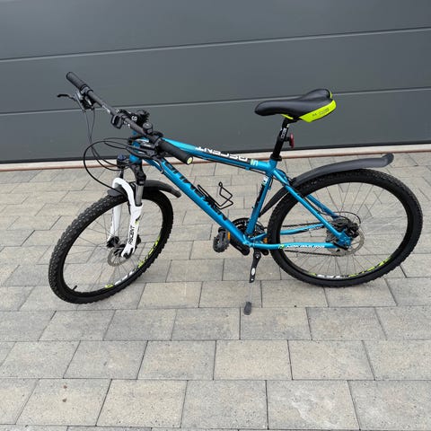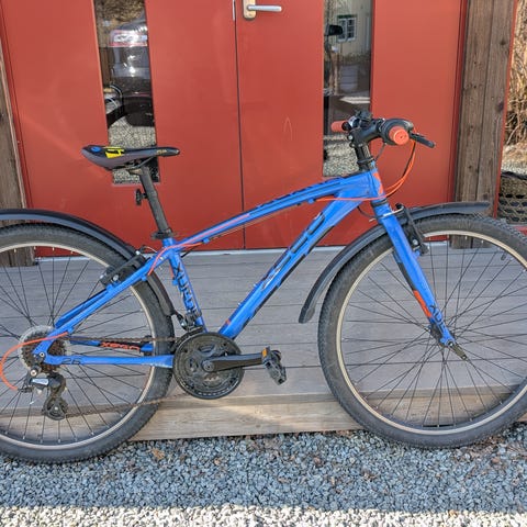 Utstyr: Aluminiumsramme, Dempegaffel foran, Shimano 24 gir, Tektro skivebremser, Kombipedaler SPD.