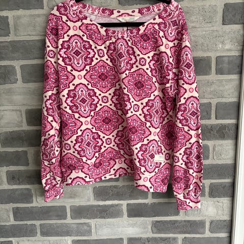 Tricot Silk bluse i størrelse M. Blusen har flerfarget mønster med svart kantdetalj ved hals og ermelinninger. Materialet er lett og delikat, egnet for formelle og uformelle anledninger.