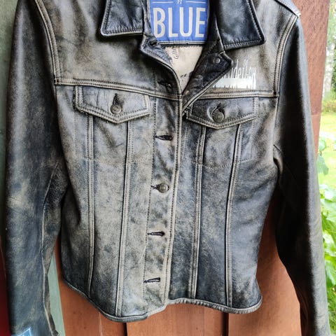 Skinnjakke (ikke ekte skinn) i fantastisk blåfarge. Veldig fine detaljer, og hele innsiden i blomstret for. Gjør det veldig pent å brette opp ermet litt.