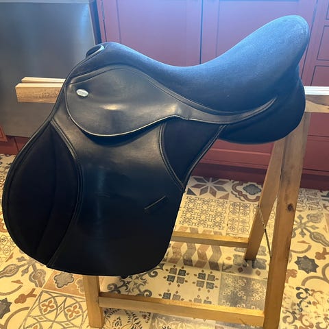 Vi selger en svært god dressursal med dypt sete, lange kapper og svært behagelige og ergonomiske kneklosser. Salen gir en balansert og profesjonell sits.