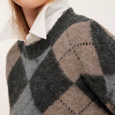 Merke er Esprit. 50%ull og 50 % akryl. Festene til hempene er alle svarte selv om det ikke ser slik ut på bilde.