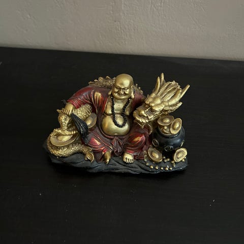 Den er 30cm lang Buddafiguren har rester av gullmaling. Er ikke sikker på hva det er lagd av. Er ganske tungt. Se eget bilde med beskrivelse av røkelses staven. Et spesielt østen samlerobjekt. Shbo 90kr pl porto. Budrunden går i 24t etter 1. Bud. 5 min gjelder. Bruker ikke fiks ferdig.
