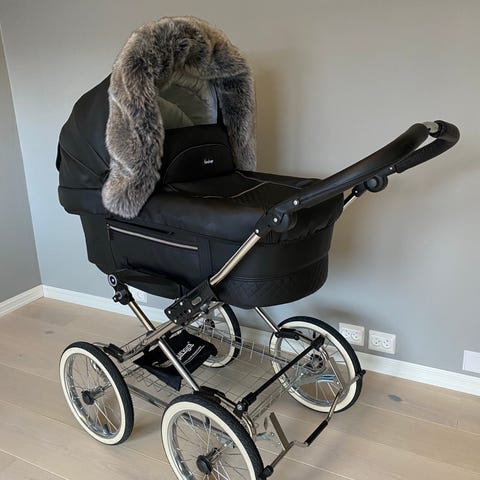 Sort regntrekk, solskjerm, myggnett, og beskyttelseshansker i grått materiale/skinn følger med vognen.