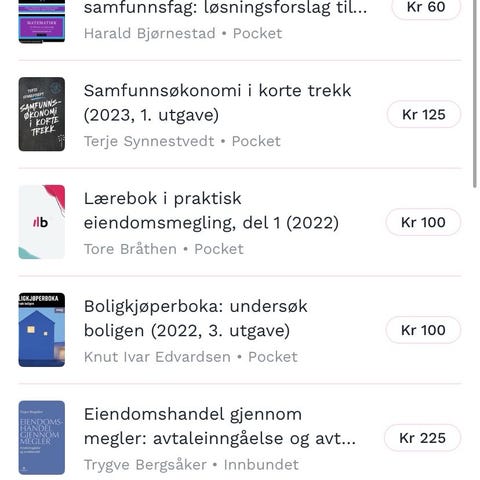 Dette er noe av pensum til Eiendomsmegling første året. Noen av bøkene er ikke åpnet og ellers er de veldig lite brukt. Ingen av de har blitt skrevet i. De selges veldig rimelig i forhold til hva de ble kjøpt for, og om det ønskes å kjøpe mer enn to bøker kan jeg ordne en pakkepris. Befinner meg i Oslo området mye av tiden og har mulighet til å møtes å levere bøkene, eventuelt kan de sendes, mot at kjøper betaler for eventuell frakt. Pris per bok står under bildene av dem!