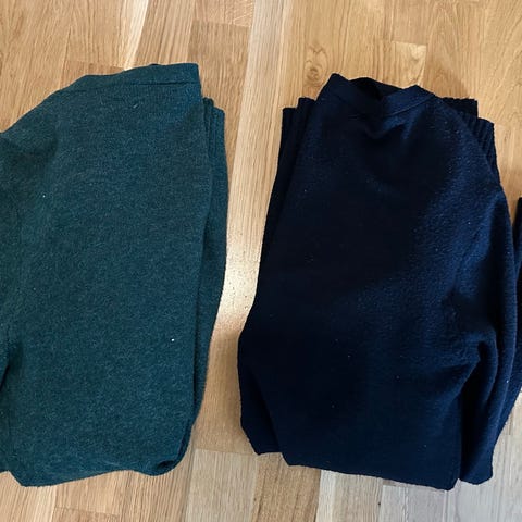 To ulltopper/gensere i burgunder og mørkegrønn fra Luca Moretti selges. Står str. S på lappen på begge, men de tilsvarer nok mer XS. Lune å ha på og i nydelige farger!