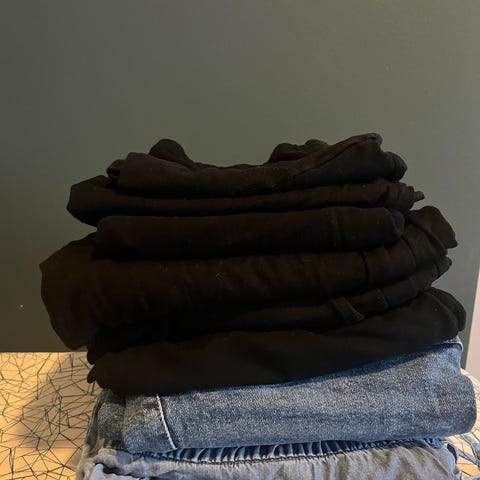4 stykk gravidbukser, 2 svarte en grå, og en blå