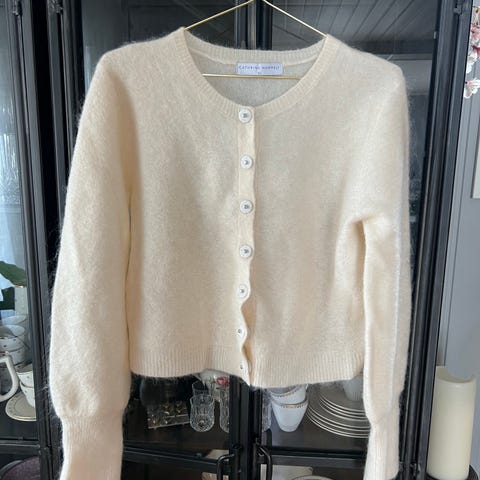 Cardigan i lys beige i det norske design-merket ONE and OTHER, str M, litt oversized, bred vrangbord nede med en splitt i hver side med skjellknapper, bomull og litt silke. Ikke brukt.