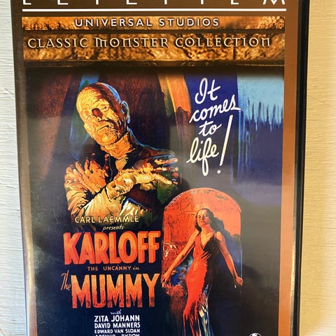 The Mummy 1932 DVD. Filmmediet i DVD-format med originalfilm fra 1932. Inkluderer spesialfunksjoner som manusnotater, kommentarspor og dokumentarer. Språk og undertekster tilgjengelig på svensk, dansk, finsk og norsk.