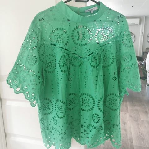 Kun prøvd på, 100%bomull. Foret fra brystet og ned så den er ikke gjennomsiktig. Ser kun igjennom på skulder/arm.
