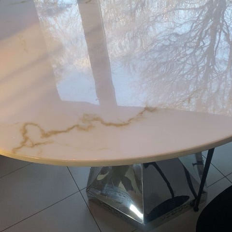 Det er et lite bord med Ø57 og høyde 42cm.Bordplate er glass m/ marmormønster og bordet er av metall.Pris kr1800,00.