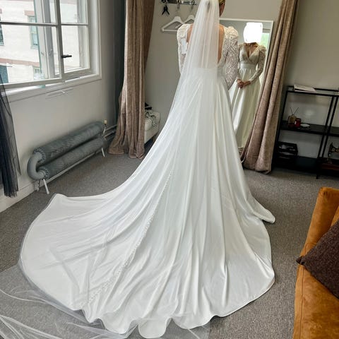 Langt brudeslør selges. Det er i god stand men bruksmerker er at den ene taggen på festet er knekt av, men fungerer fortsatt bra.
