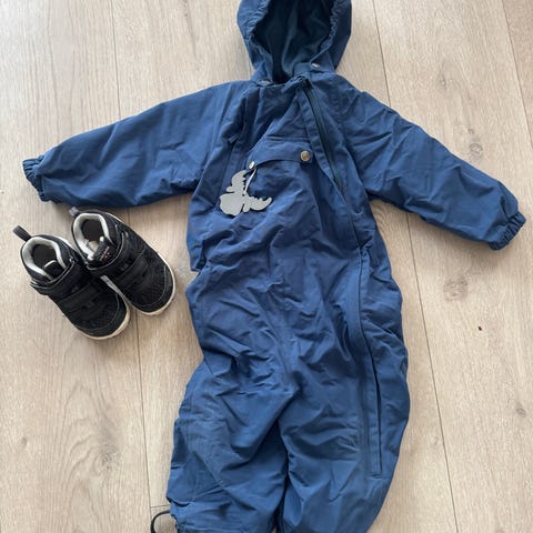 Sett med body og sparkebukse fra Wheat i fargen mørk blå. Buksen har knapper nede så man slipper å ta den helt av v/ bleieskift. Den har også to knapper på selene så den lille kan vokse litt i den. Lite brukt, ingen flekker.