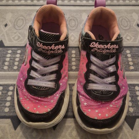Skechers barne joggesko i størrelse 26, designet for unisex bruk. Skoene har en kombinasjon av blå og rosa farger med et mønstret stoffmateriale. De har borrelåslukking og elastiske lisser for enkel på- og avkledning. Sålene er laget for god demping og støtte ved lek og daglig bruk.