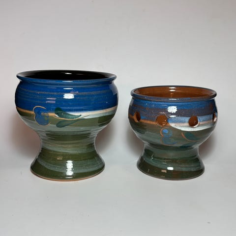 Denne vintage blomsterskålen/stettskålen kommer fra det tidligere Øst-Tyskland (DDR). Den er laget av Strehla, som lå i byen ved samme navn i det tidligere Øst-Tyskland. 1960-/70-tallet. Skålen har en fantastisk, denimblå glasur på innsiden - nydelig farge! På utsiden er den brun med et abstrakt mønster i relieff. Stetten er i grov tekstur, beige matt glasur. Skålen er stemplet under med Strehlas stempel. Det er noen bruksspor på innsiden, og det er en utvendig sprekk under stetten. Det er ikke skjemmende, men prisen gjenspeiler dette. Se bilder. Høyde: 8 cm. Bredde: 19 cm. Diameter sokkel: 8,5 cm. Vekt: 654 g.