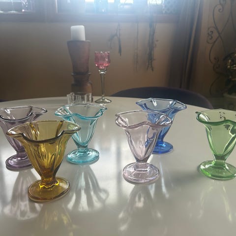 Kolleksjon av vakre skåler, lysestaker og fat i glass.