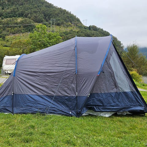 Supert telt for familie, 2 voksne og 2 barn. God plass i sovesal og rikelig med plass til «stue» og «kjøkken». Jeg selger da vi har fått nytt telt. Det er et LITE HULL i bunnen av teltet, det går veldig fint å lappe dette. Legger ved bilde. Vil uansett anbefale å ha presenning under teltet for da holder teltet seg rent og det er enklere å pakke ned.