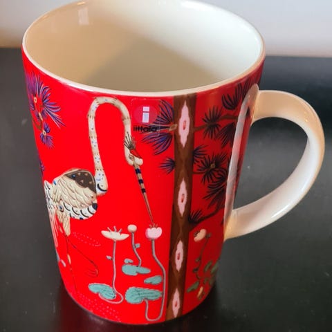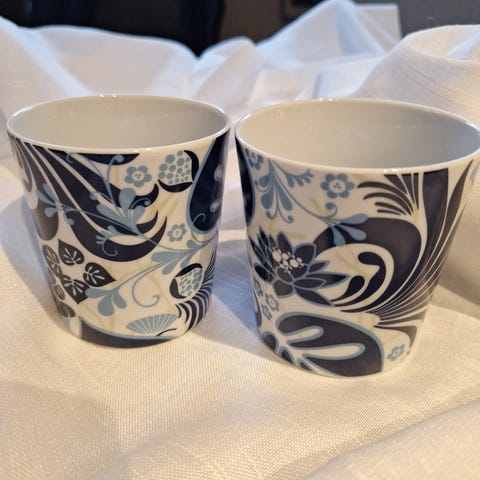 Iittala Taika kopp laget av porselen med et dekorativt svart og hvitt mønster. Koppen har en kapasitet på 0,4 liter og er egnet for servering av varme og kalde drikker. Designet kombinerer funksjonalitet med estetikk. Selges for kr 150 per krus.
