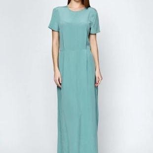 H&M maxikjole i grønn farge, størrelse XS. Kjolen har kort erme, rund hals og åpen rygg med knappelukking. Ligner Rouje og Ganni. Materialet er 100% silke og perfekt til bryllup. Brukt en gang av meg.