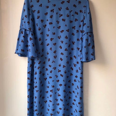 Ganni kjole i størrelse 38, blå farge med blomsterprint. Kjolen har lange ermer og et løst, komfortabelt snitt. 100% Viskose.
