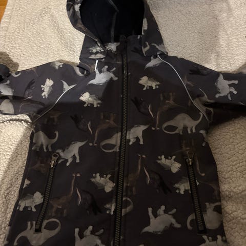Name it Barnejakke i størrelse 80, flerfarget design, egnet for både gutter og jenter. Jakken har hette og glidelås, med dyreprint i ulike farger på jakkeoverflaten.