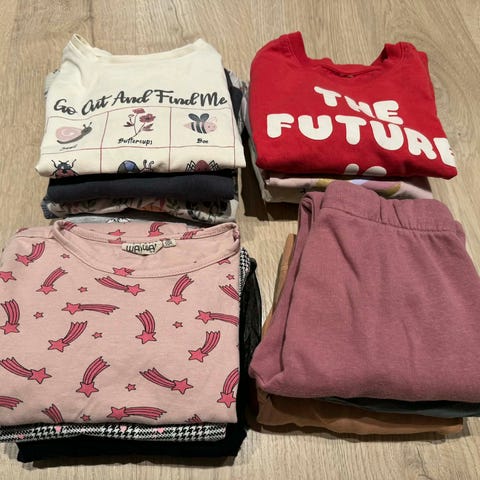 Selger 7 gensere/jakker i str 80. Ingen hull eller mangler men noen små flekker på noen av de. Strikkejakken er hjemmestrikket.