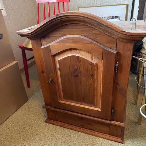 Hjemmesnekret vinskap med glassdør og plass til 16 flasker. Kan henges på vegg eller settes på en sjenk. Må hentes.