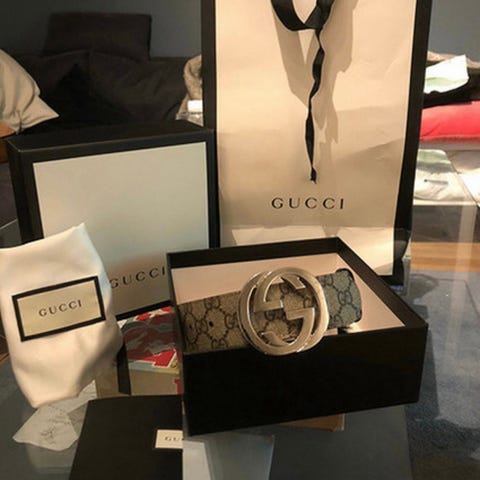 Gucci GG Supreme belte med sammenflettet G-spenne. Beltet er laget i svart lær med GG Supreme mønster, og er designet for unisex bruk. Ble kjøpt som konfirmasjonsgave 19.mai og gitt til konfirmanten 1.juni. Beltet er helt strøkent og akkurat som nytt da det knapt har blitt brukt. Alt er med som bildene viser. Gutten vokste for raskt og vi måtte kjøpe nytt belte.