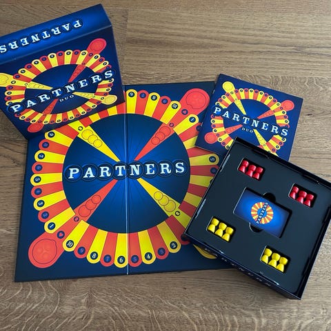 Brettspill med flere brikker i ulike farger og et brett med ruter i rød og hvit. Brikkene er dekorert med fargerike mønstre. Egnet for bordspill og familiespill.