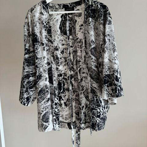 Flott halvlang kimono i tynn polyester. Litt gjennomsiktig. Svært lite brukt, ser ut som ny. Str. XS.