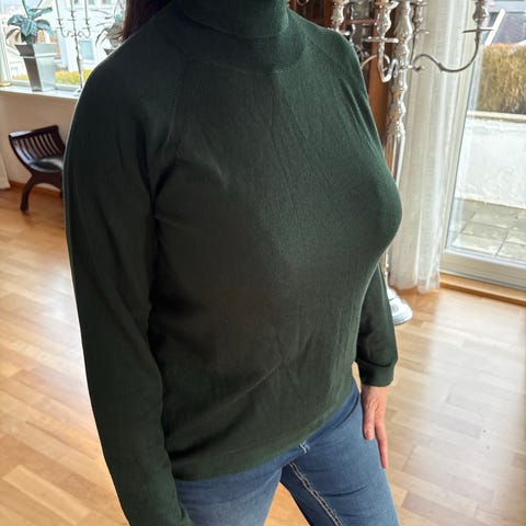Nydelig og myk Benetton genser. Mørkeblå stripe nederst på ermene og nederst på bolen. God stretch. Str. L men føles mer som en Str.M