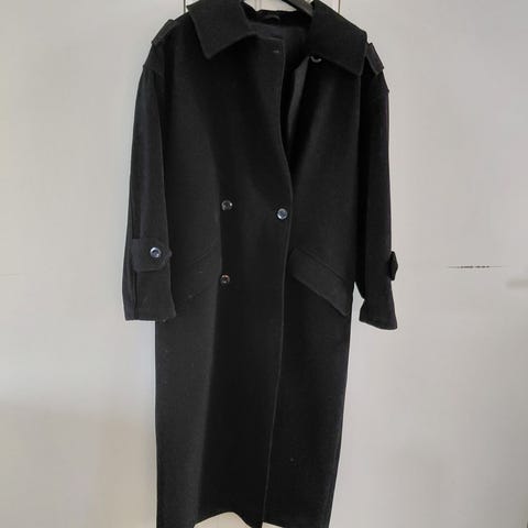 Svart cardigan i størrelse M for kvinner med mønster i hvitt og svart. Cardiganen har lange ermer Materialet er ikke spesifisert, men plagget har et dekorativt og geometrisk mønster.