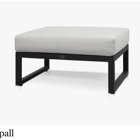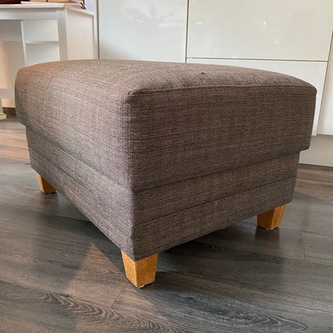Jeg kjøpte denne pallen på finn.no selv for ca 2 år siden. Den har stått på hytte som nå skal selges. Fargen er svært anvendelig med andre fargetoner. Den er litt mørkere brun enn det som kommer frem på bildene. Vet ikke hva tekstilet heter. Midt på pallen er det en ca 6 cm rund skjoldete vannflekk, som er synlig avhengig av lys i rommet. Kanskje den forsvinner hvis man har en rensemaskin og " vasker" hele pallen, men det har ikke jeg.
