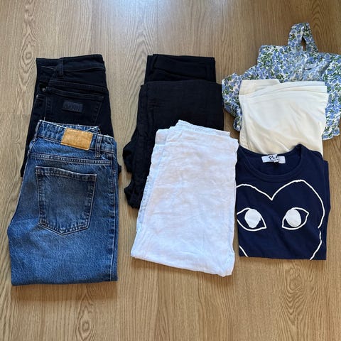 Det er 8 bukser og 2 tynne gensere. Pent brukt. Klærne er brukt samtidig og er praktisk i samme størrelse, og stort sett er str 164. To av buksene er litt større, str 170.