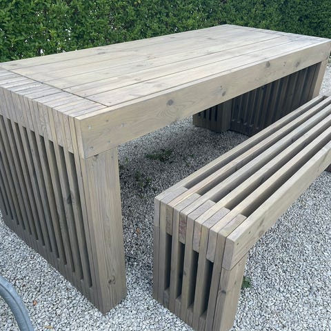 Moderne og solid utebord. Dette blåser ikke bort med det første og tåler å stå ute hele året. Impregnert furu.