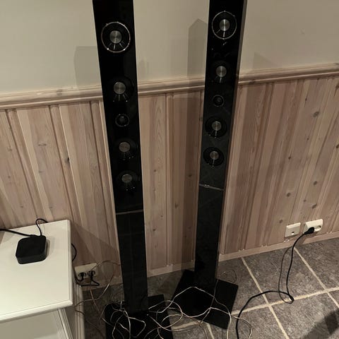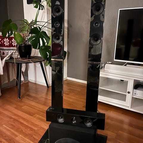 Samsung HT-THX22 er en hjemmekinopakke som inkluderer flere høyttalere og en subwoofer i svart farge. Systemet består av to høye gulvhøyttalere, en subwoofer, og flere mindre høyttalere for surroundlyd. Enhetene er designet for å gi surroundlydopplevelse i hjemmet. Materialet er hovedsakelig plast og metall. Produktet er egnet for bruk i stue eller hjemmekinooppsett.