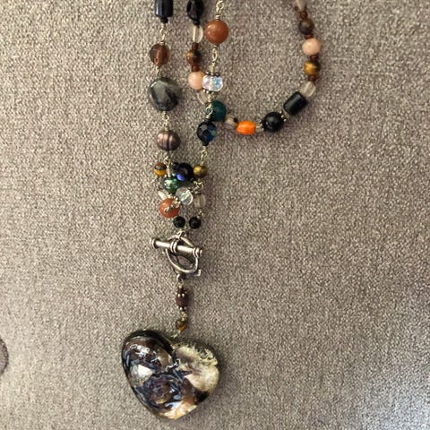 2 nydelige kjeder i bohem stil, i bruntoner med glassperler og treperler. Det ene er justerbart med lærreim.