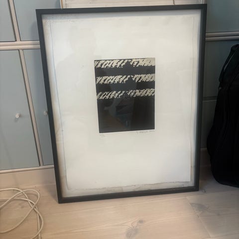 Trykket er innrammet med en ramme i gullfarge. Signert og nummerert i nedre kant.