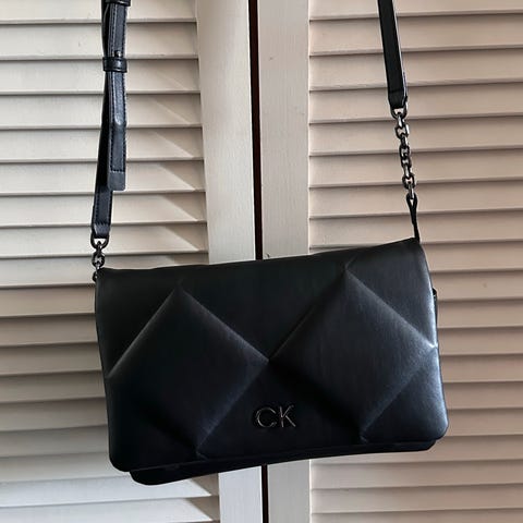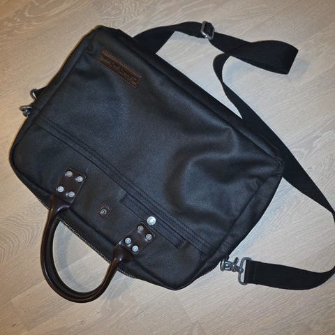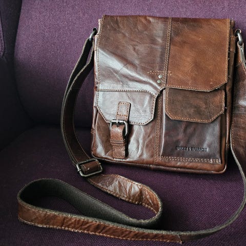 Lærveske med lang skulderen. Glidelås på toppen. Utvendig lomme med glidelås. Innvendig rom og lomme med glidelås. Mål på veska 37x36cm