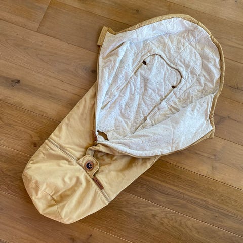 Glidelås midt på, som gjør at vognposen kan brukes som leketeppe