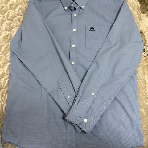Skjorten har lyse knapper og regulerbar mansjett med splitt og knapp.