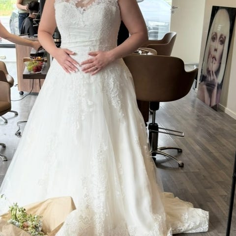 Nydelig brudekjole med blonder. Er renset etter bryllups fest. Med snøring i rygg. Vil si str er fra 42-50. Det er lov å komme å prøve kjolen.