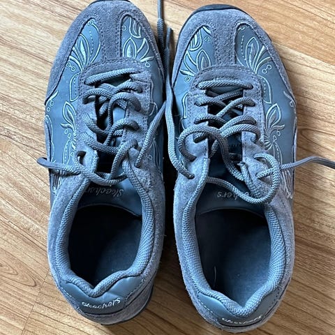Skechers Sneakers størrelse 37. Skoene er lys rosa med glitter og laget med pustende mesh-materiale.