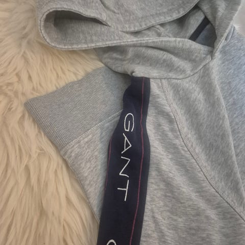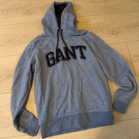 GANT Hoodie i størrelse M, grå farge. Laget av mykt materiale med hette og frontlomme. Designet for menn. Missfarging foran på hettegenseren og slitasje på den ene albuen.