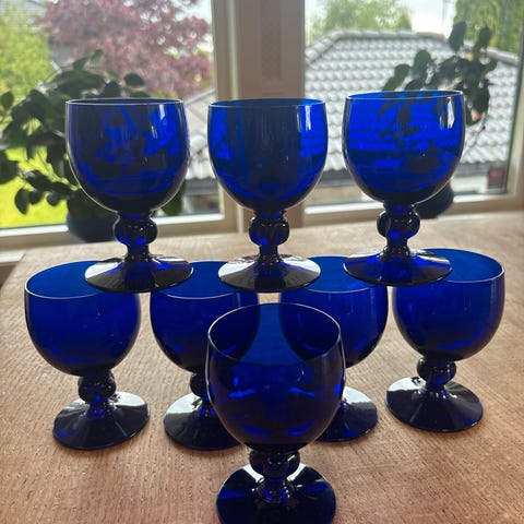 Blå vintage Drammeglass i sett med 6 stk. koboltblå. Egnet for servering av likør eller små drikker. Passer til samling eller bruk ved spesielle anledninger. Det ene glasset har en skade på glasset, se siste bilde. Det er også noen plasser hvor sølvfargen (sølvplett?) har skallet litt av.