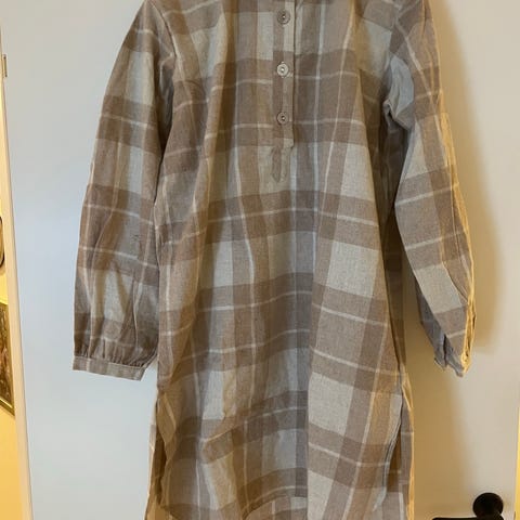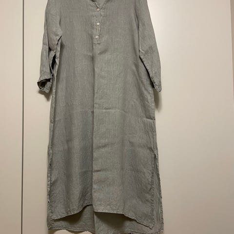 Selger en nydelig kjole fra Stories by Kine i 100 % lin. Den har et avslappet og tidløst snitt med krage og trekvart ermer