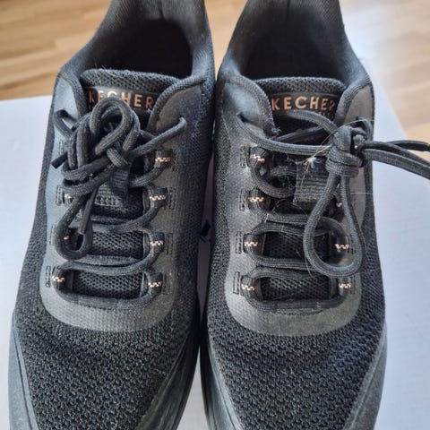Skoene har en overdel i tekstilmateriale i grå farge, med svart detaljer.